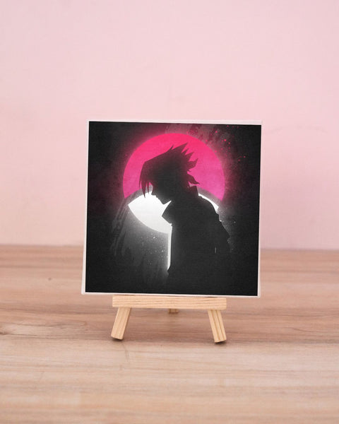 Printed on premium textured canvas and accompanied by a sleek wooden easel stand, this piece is ready to elevate your desk, shelf, or workspace. Whether you connect with Sasuke’s story or simply admire the Uchiha aesthetic, this canvas delivers quiet strength and bold presence.