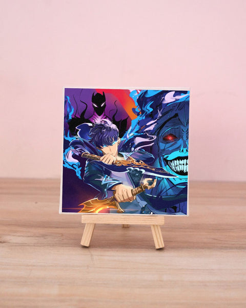 Step into the dungeon of power with the “Sung Jin-Woo – Shadow Army Canvas with Stand.” This detailed artwork features Jin-Woo, the unstoppable protagonist from Solo Leveling, surrounded by his powerful shadow army and fierce demonic enemies. With his blade drawn and aura blazing, this canvas captures his full transformation into the Shadow Monarch.
