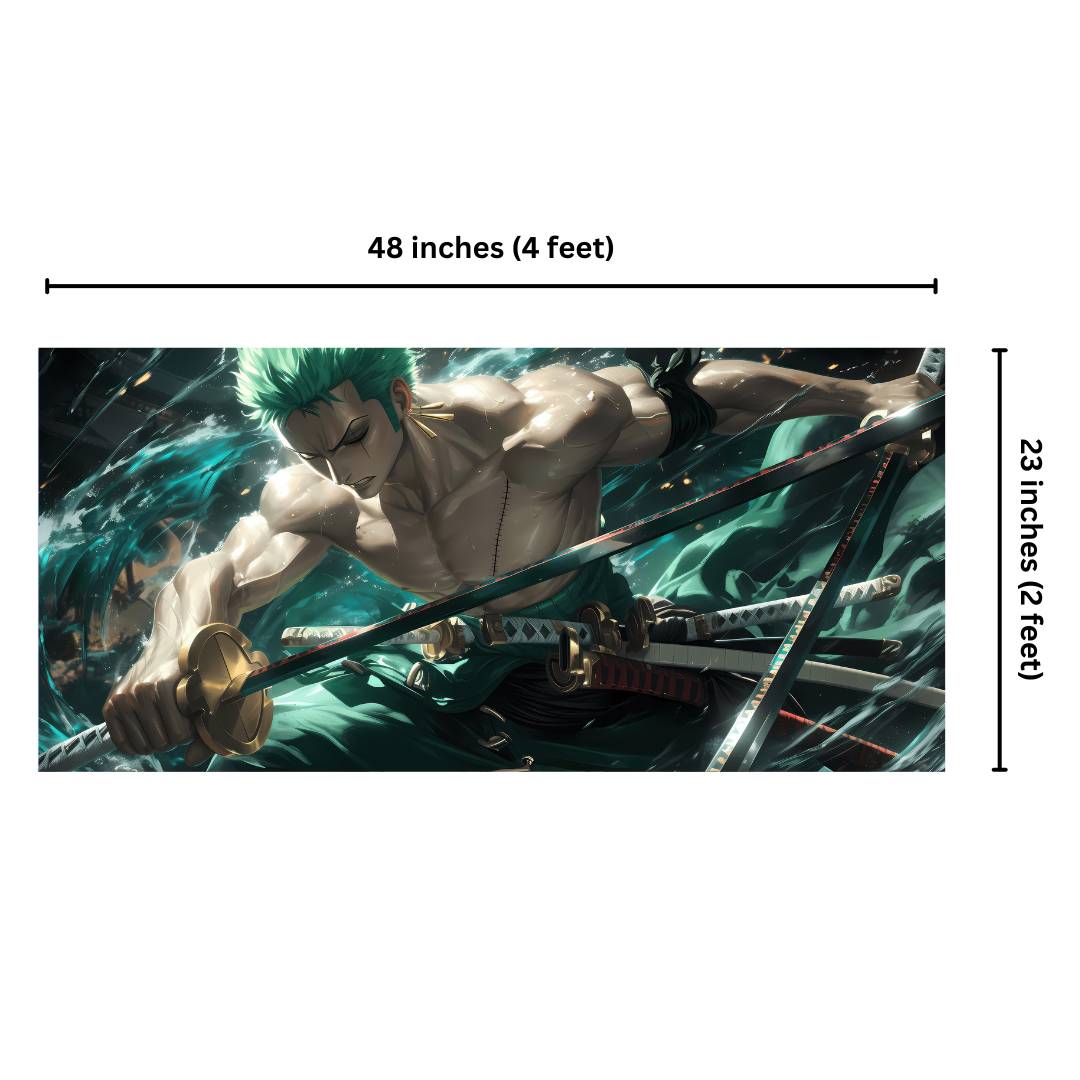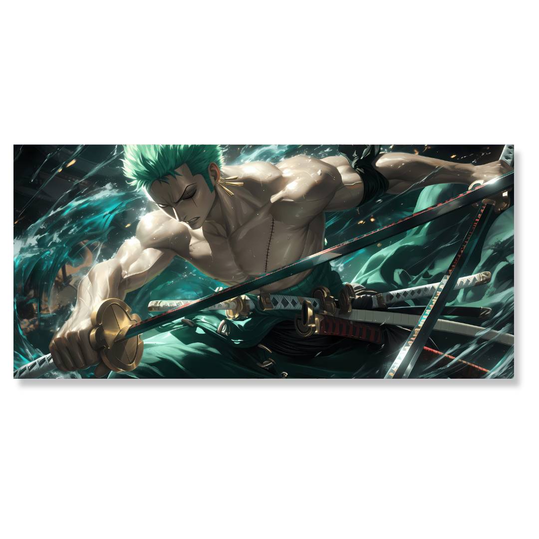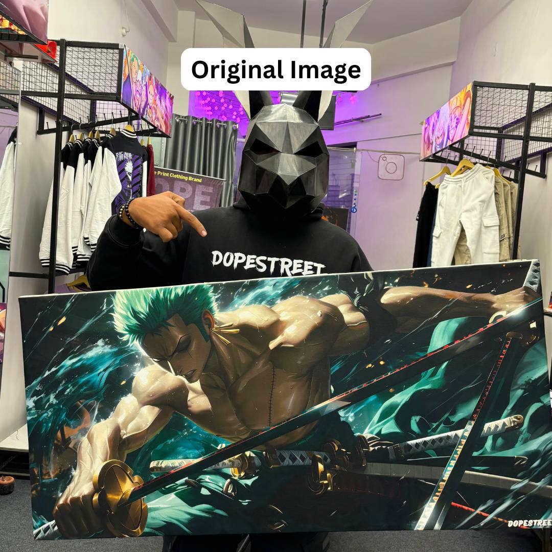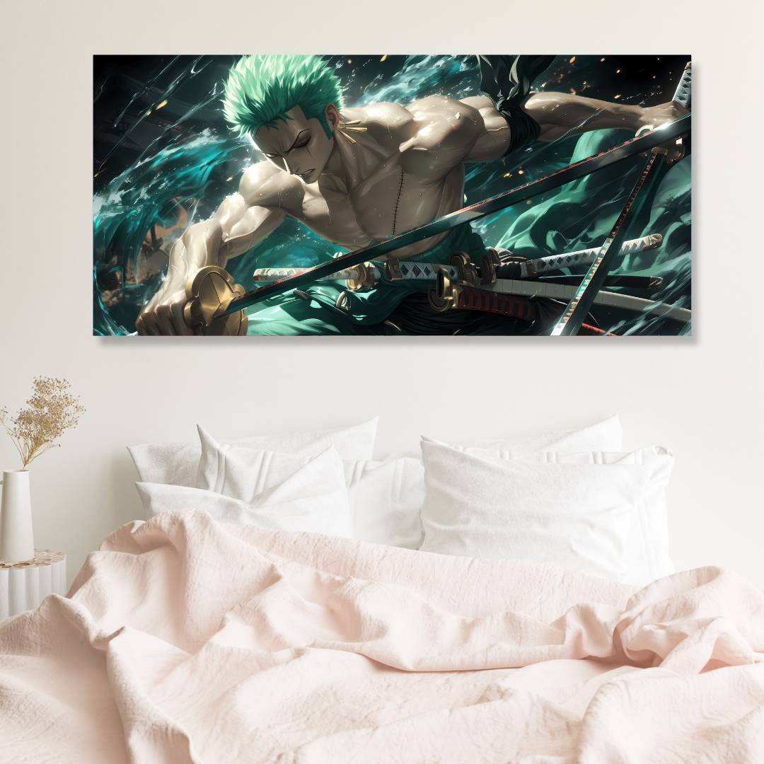 Set sail into the Grand Line with our stunning One Piece canvas art featuring the legendary swordsman, Roronoa Zoro. This masterpiece, crafted to resemble a hand-painted oil painting, brings the world of pirates to life.