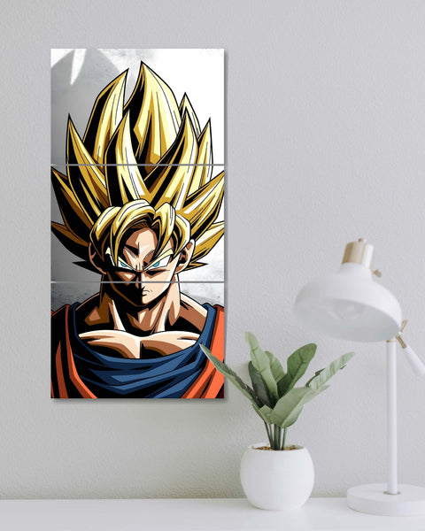 Split Design: Features a multi-panel layout that visually emphasizes the height of Goku's iconic SSJ hair and the incredible power radiating from him.