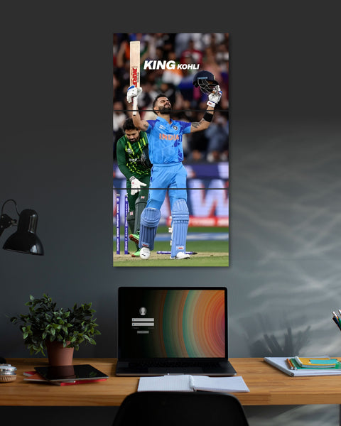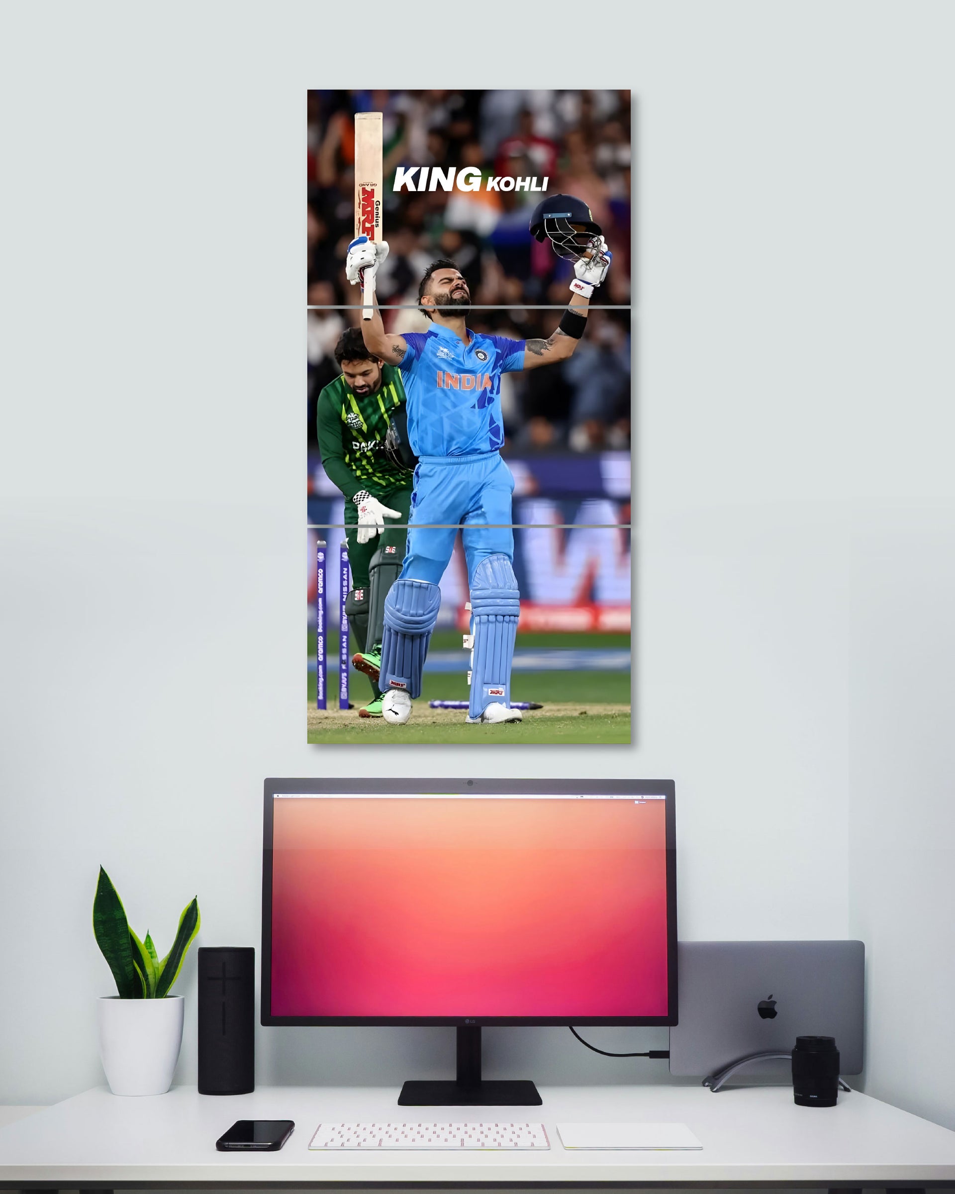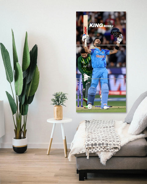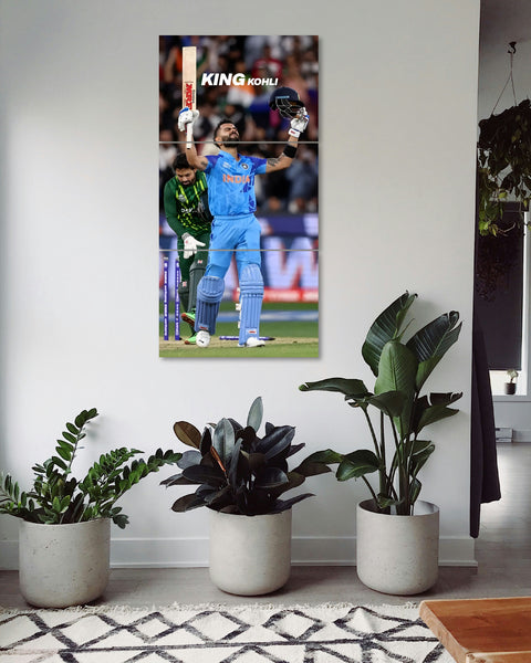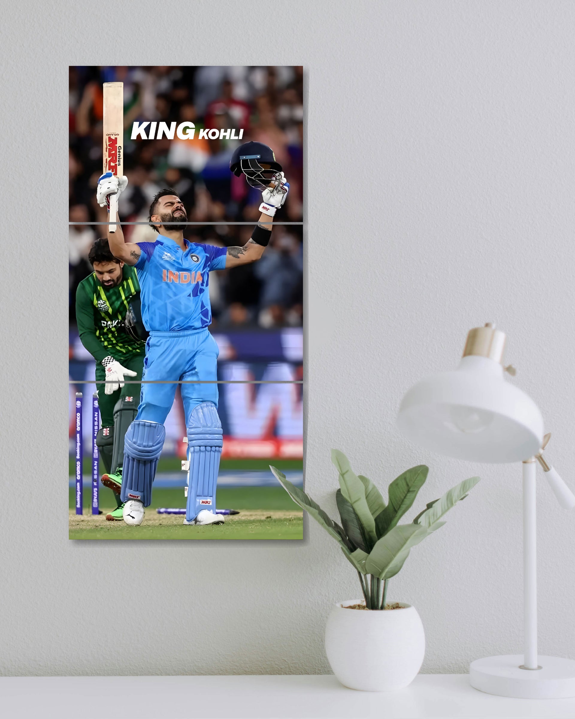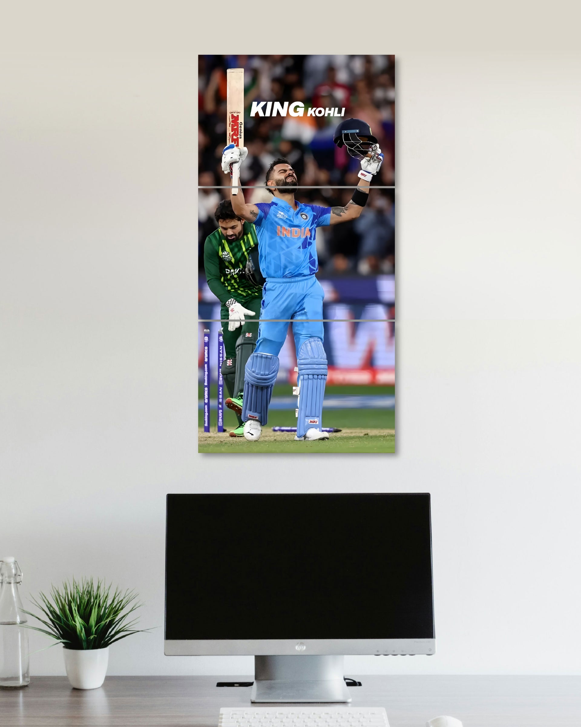 Witness the emotional climax of a legendary innings with the definitive King Kohli Vertical Split Poster. This iconic wall art captures Virat Kohli (The Chase Master) in a moment of pure, triumphant celebration, raising his bat and helmet after leading Team India to a miraculous victory (widely considered the best knock of his career). The title KING KOHLI boldly affirms his legendary status.