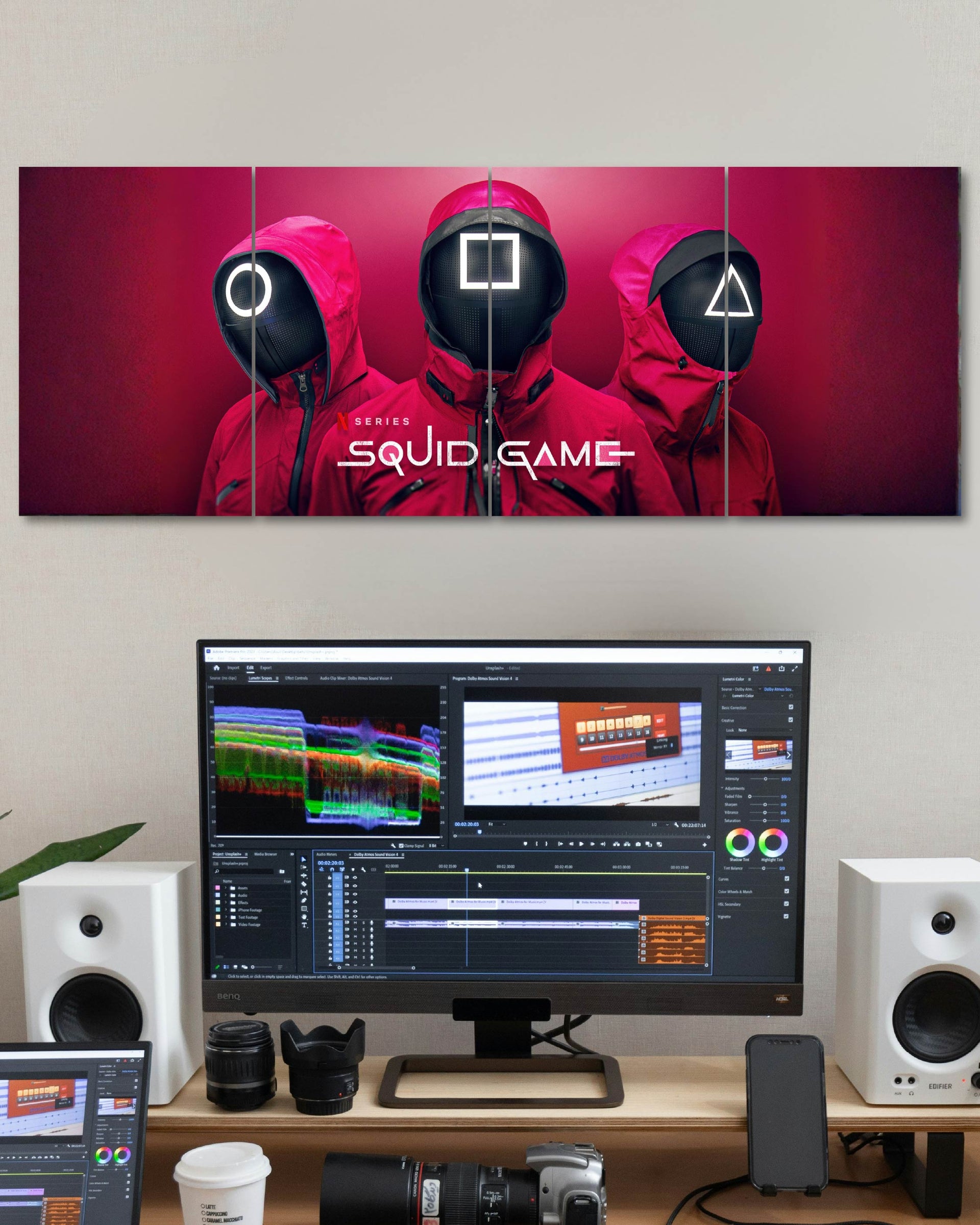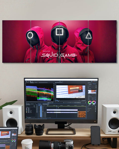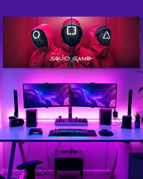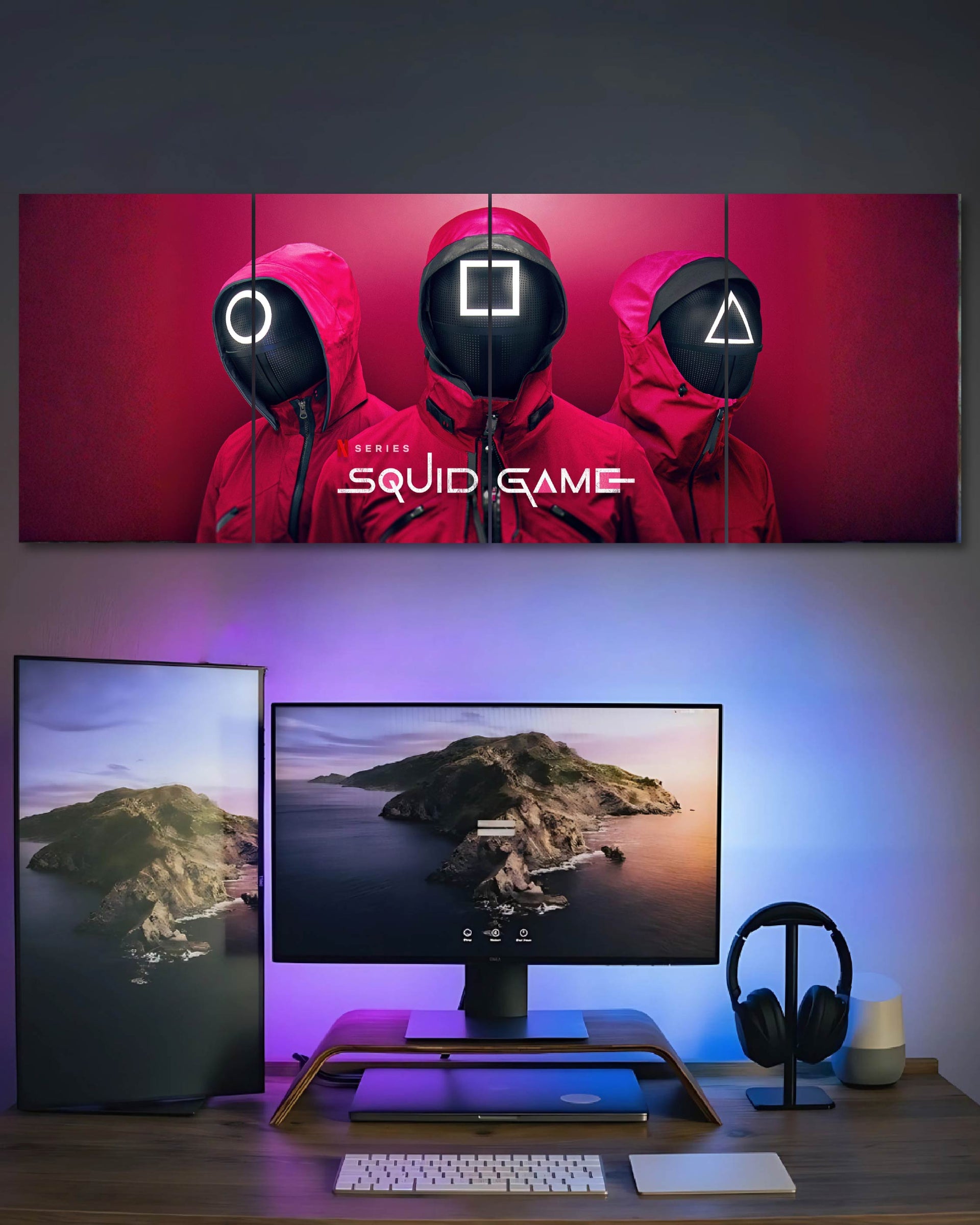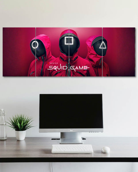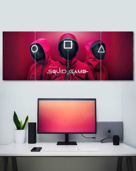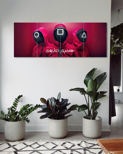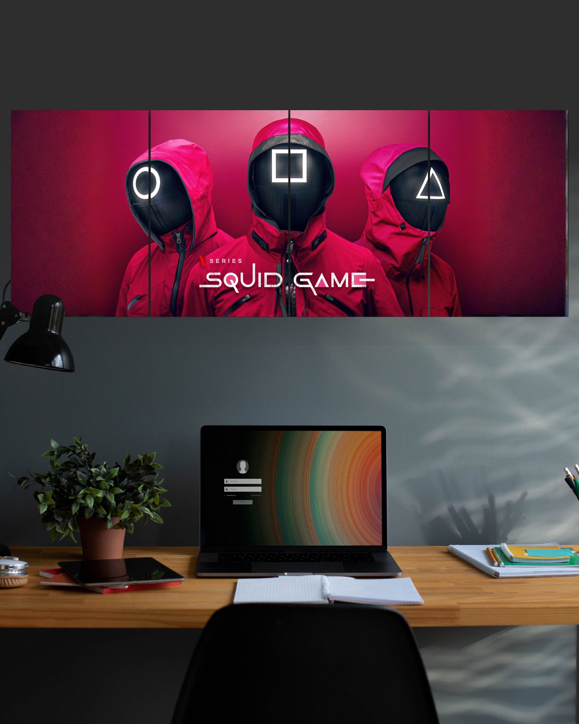 This large 4 feet by 1.5 feet multi-panel piece uses a wide format to create a stunning, tense mural. Itβs the perfect centerpiece for any fan fascinated by the mystery, social commentary, and viral success of the Netflix Korean Drama.