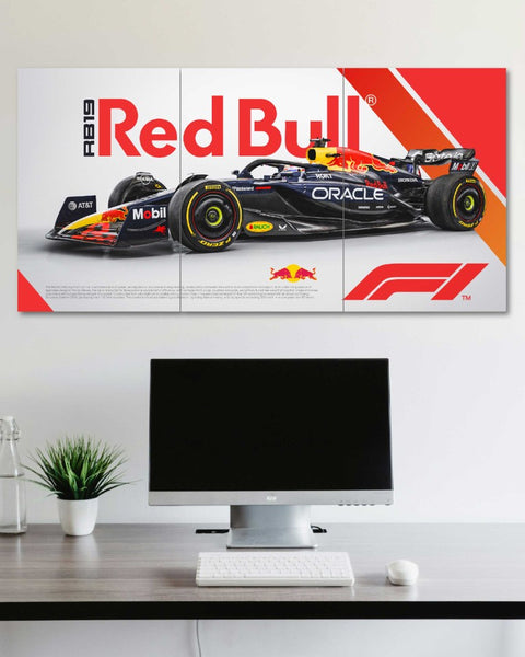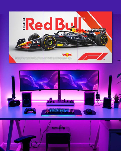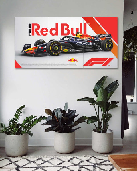 Experience the thrill of Formula One every day with our Red Bull F1 Poster. This dynamic wall art captures the energy and speed of Red Bull Racing, bringing the adrenaline of the racetrack right into your home or office. Featuring a stunning action shot of the Red Bull Racing car, this poster showcases high-performance design and competitive spirit. The unique split design car poster style means three separate A3-sized prints combine to form one panoramic scene that commands attention on any wall. The high-impact visual detail and vibrant team colors make your wall come alive.