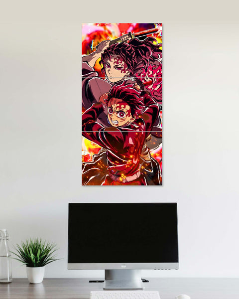 Split Design: Features a multi-panel layout that visually links Tanjiro and Yoriichi, capturing the fluid, fiery motion of their unique Sun Breathing forms.