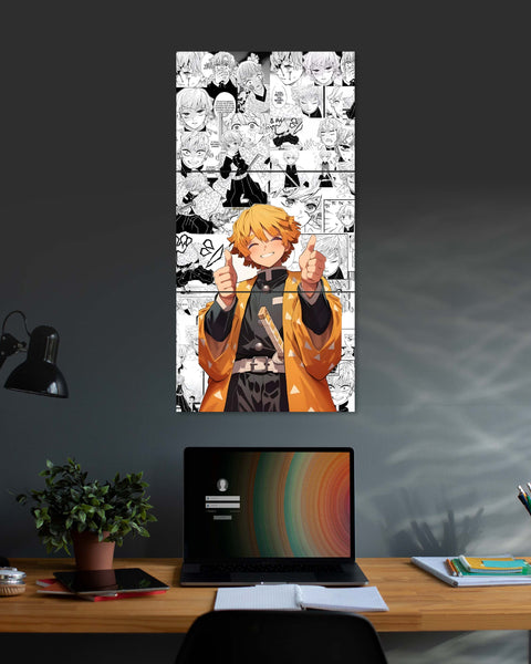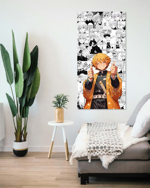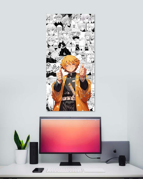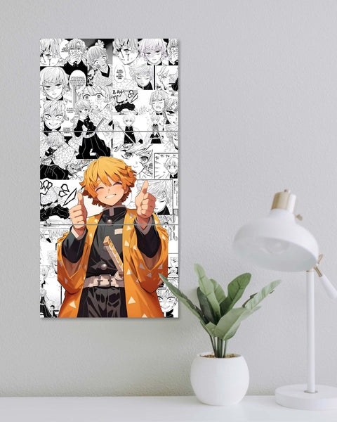 Celebrate the charming and chaotic spirit of Zenitsu Agatsuma with this exclusive manga-inspired vertical poster. This vibrant wall art captures Zenitsu's signature, heartwarming smile and thumbs-up, framed by an immersive collage of original Demon Slayer manga panels that beautifully illustrate his full range of expressions—from terrified cowardice to determined bravery.