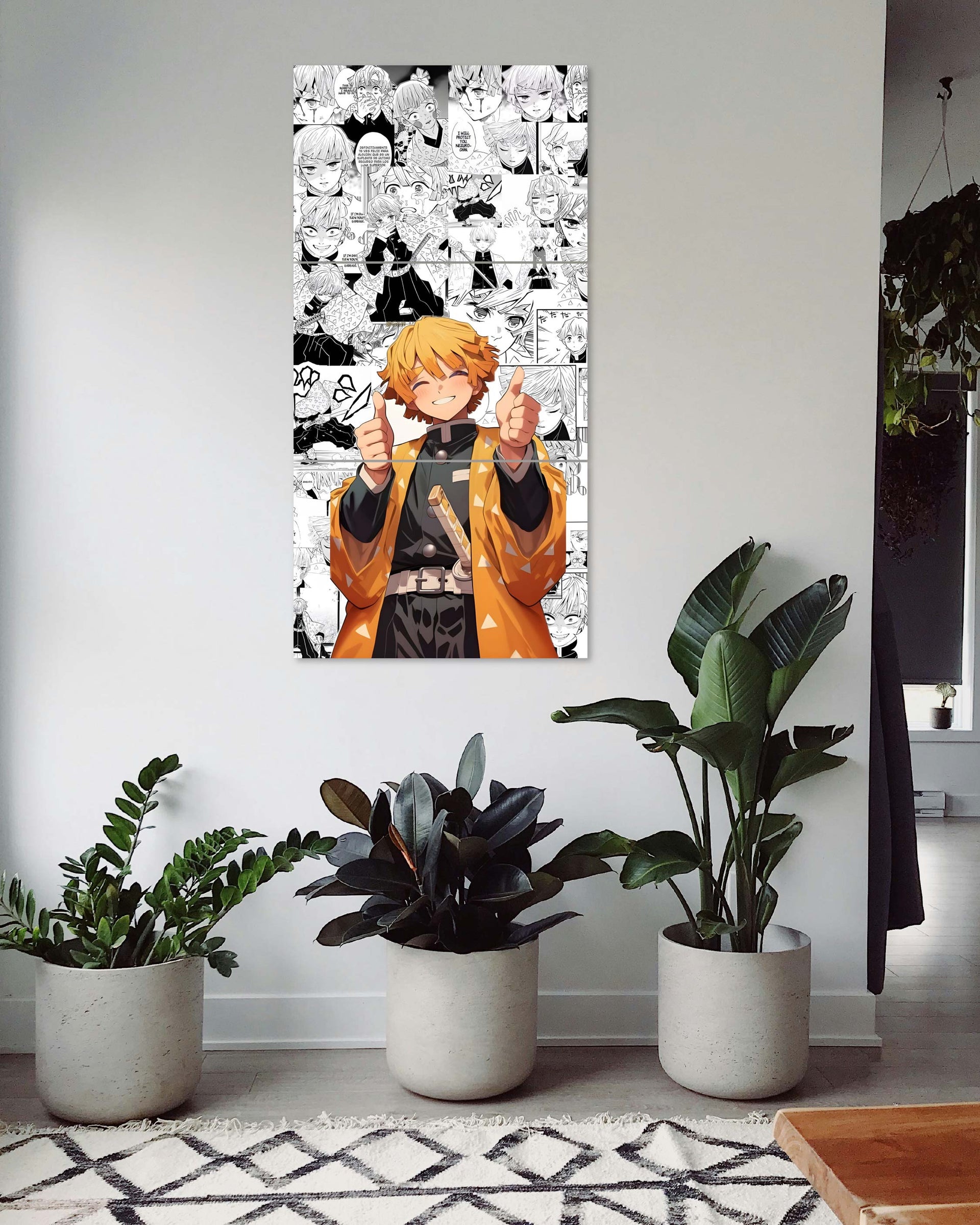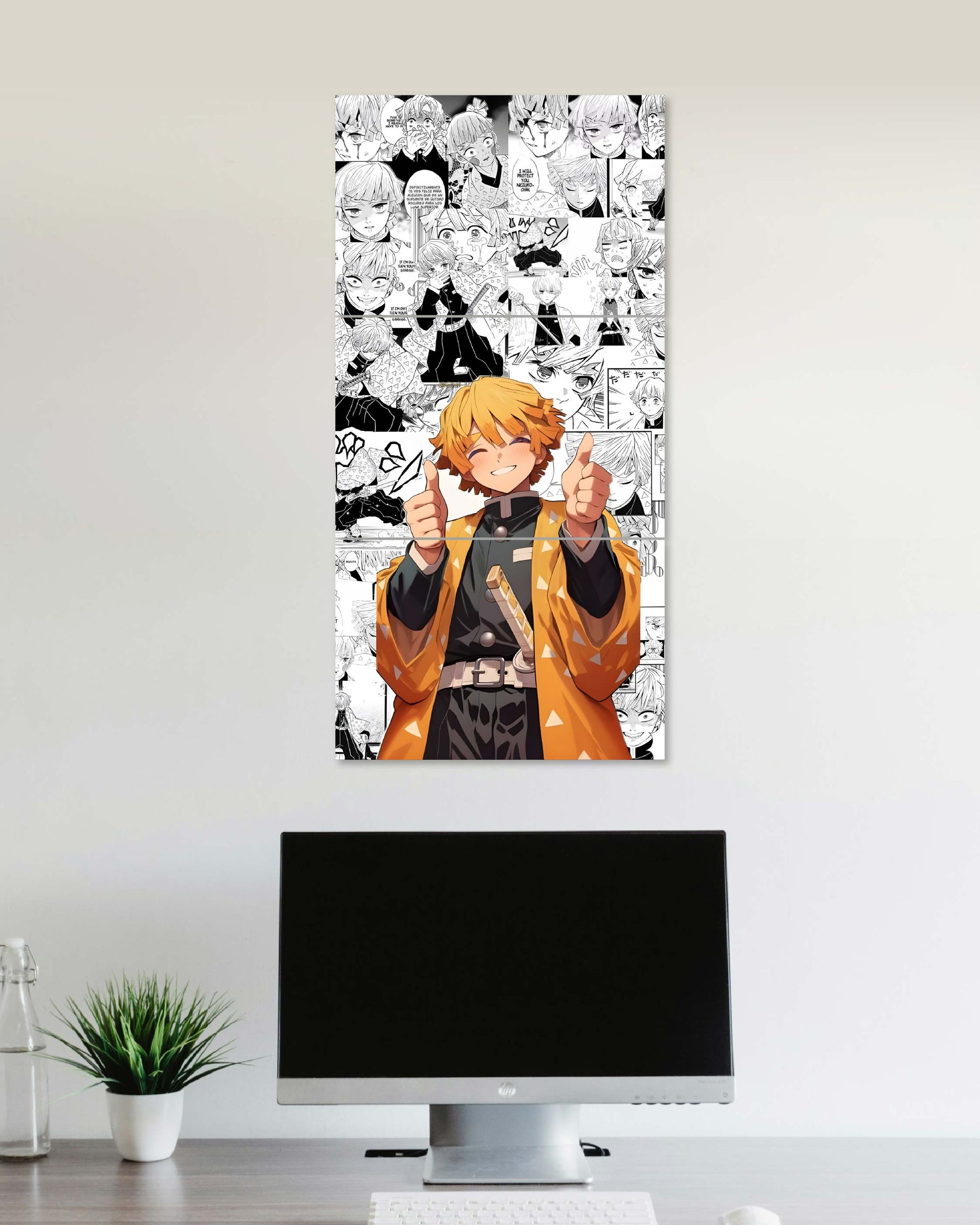 This dramatic Vertical Split Poster (approx. 1.5 ft W x 4 ft H) is the ultimate piece for any fan who loves Zenitsu's comedic genius and his status as the "Best Boy" of the Corps. The black-and-white manga background provides an artistic, graphic contrast to his signature yellow haori.